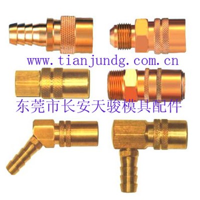 三,模具水咀分為傳統模具水咀和快接水咀:傳統水咀一頭是牙,另一頭是插軟管,常用的牙為1/8PT、1/4PT、1/2AT(粗牙)、3/8AT(粗牙)、M12*1.75、M10*1.5,插軟管那頭的直徑為10MM和12MM,也可以按要求的尺寸生產;快接水咀一頭是牙,另一頭是插快速接頭,常用的牙為1/8、1/4、3/8、1/2等,快接那頭是根據不同的品牌形狀不同。